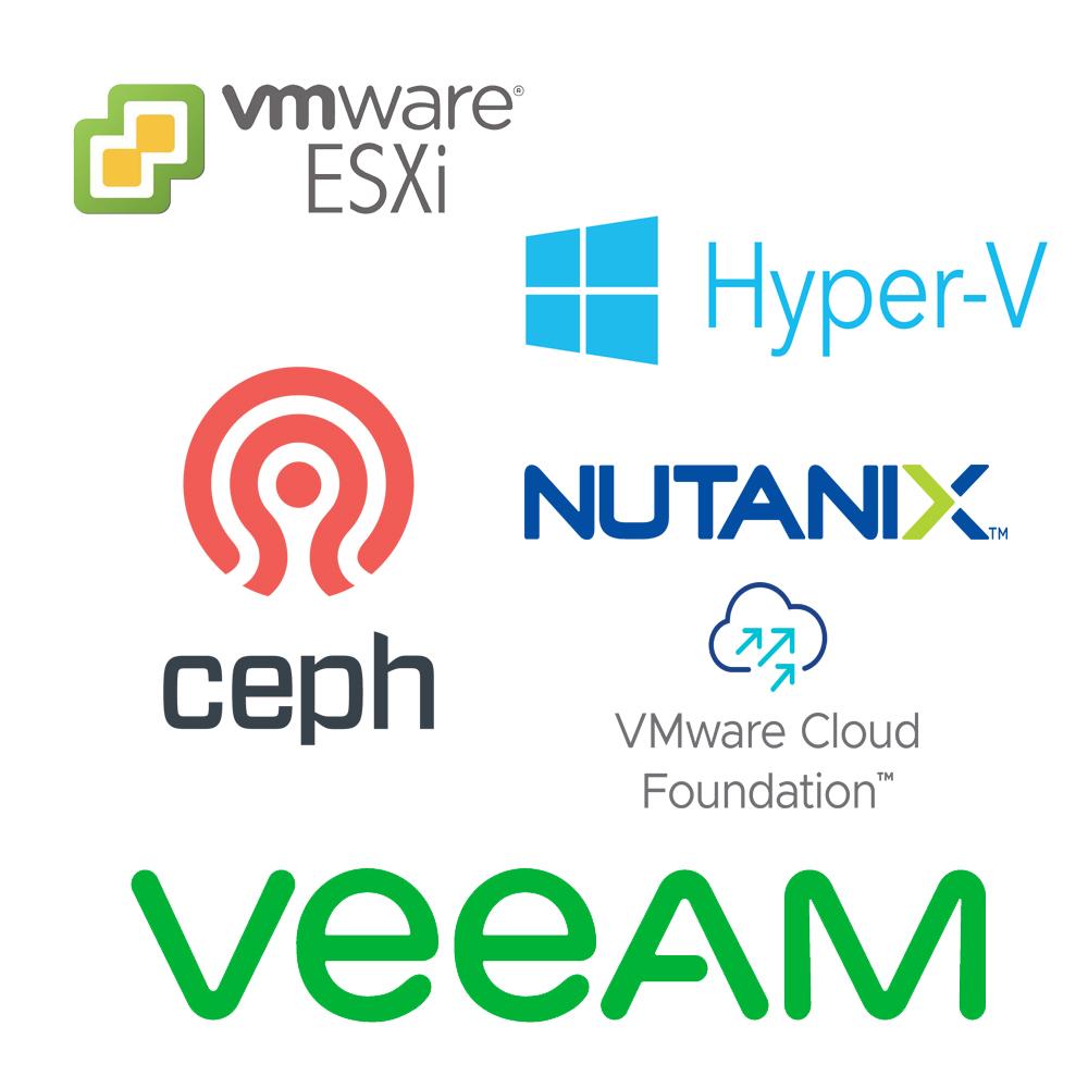 Виртуализация серверов VMware vSphere (ESXi), Microsoft Hyper-V, Citrix Hypervisor, zVirt (российская). Назначение: Запуск множества виртуальных машин на одном физическом сервере. Виртуализация хранилищ (SDS) VMware vSAN, Microsoft Storage Spaces Direct, Ceph. Назначение: Объединение дисков серверов в общее отказоустойчивое хранилище. Резервное копирование Veeam Backup & Replication, Acronis Backup, Commvault. Назначение: Защита данных, быстрое восстановление после сбоев. Управление инфраструктурой VMware vCenter, HPE OneView, Dell OpenManage. Назначение: Централизованный мониторинг и управление серверами и ВМ. Платформы HCI Nutanix, VMware Cloud Foundation. Назначение: Готовый комплекс из серверов, СХД и управления в одном стеке.