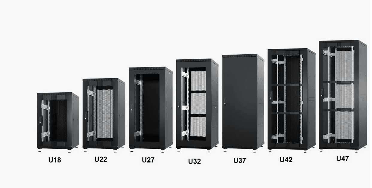 Шкафы напольные Металлические шкафы высотой 22U–47U. Серверные (глубокие, с вентиляцией) или телекоммуникационные. Назначение: Размещение серверов, коммутаторов, патч-панелей в серверных комнатах. Шкафы настенные Компактные шкафы 6U–15U для этажных узлов связи. Со стеклянной или металлической дверью. Назначение: Размещение оборудования в коридорах или офисах без серверной. Аксессуары Полки, блоки розеток (PDU), вентиляторные блоки, кабельные органайзеры. Назначение: Удобное размещение и охлаждение оборудования, укладка кабелей.